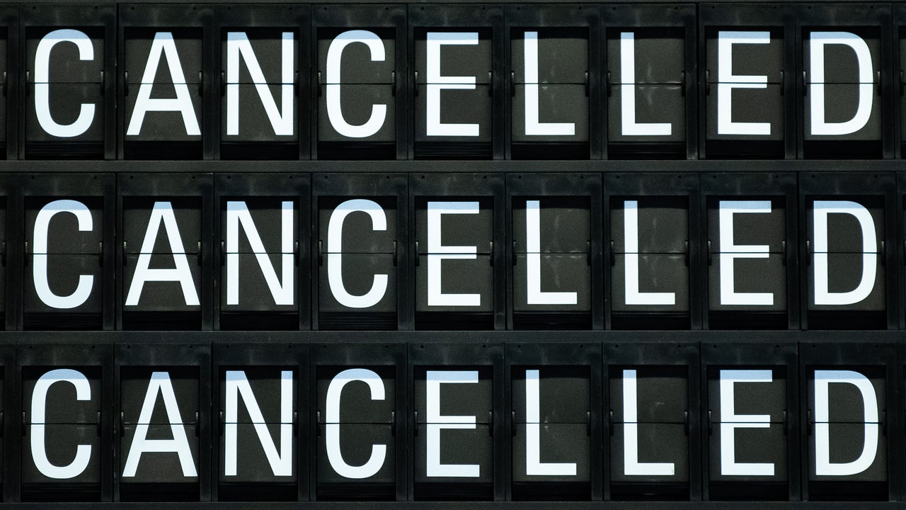 A board displays cancelled flights (Photo by SILAS STEIN/dpa/AFP via Getty Images)