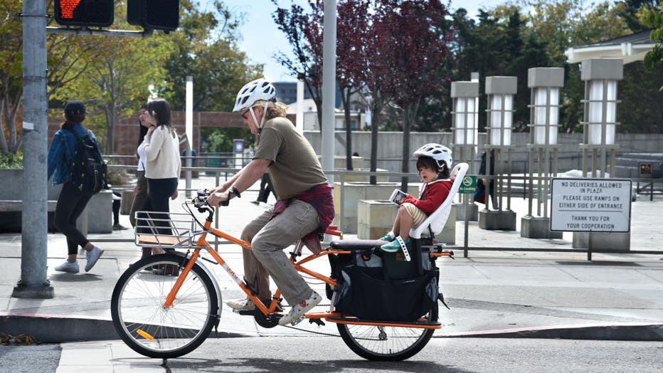 A man rides a bike with a child passenger in San Francisco. A new study suggests choosing cycling for everyday trips may help lower the risk of dementia. (Photo by Robert Alexander/Getty Images)