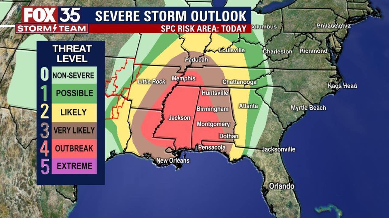 Severe storms are also possible in many other cities including Nashville, TN, New Orleans, LA and Birmingham, AL (3/5 "Very Likely" threat); Atlanta, GA, St. Louis, MO, Louisville, KY (2/5 "Likely" threat); Indianapolis, IN, Cincinnati, OH and Tallahassee, FL (1/5 "Possible" threat).