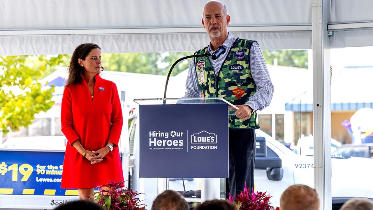 Joe McFarland, Lowe's executive vice president of stores, speaks in North Carolina as the company announces its Skilled Trades Academy for veterans. (Lowe's )