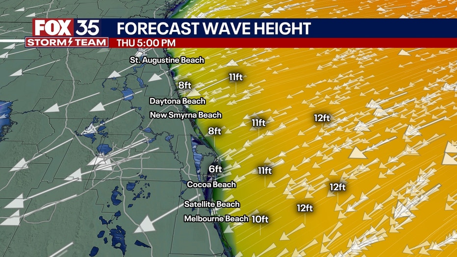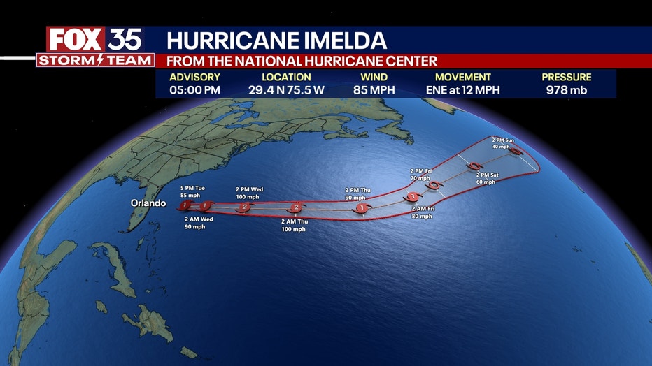 "Spotty showers and tropical downpours continue to circulate around Imelda and inland across Central Florida. The higher chances remain near the beaches, but we still can't rule out isolated showers tonight around Orlando," said FOX 35 Storm Team Meteorologist TJ Springer. "The wind stays elevated into the overnight as well with gusts around 20–30 mph. Imelda continues to work eastbound away from the East Coast overnight with drier air starting to filter in."