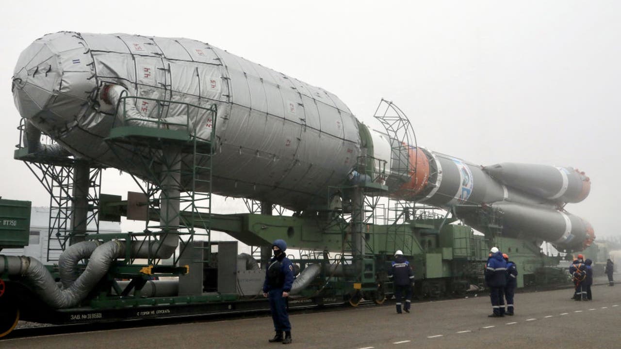 Soyuz-2.1b rocket carrying OneWeb satellites installed at Baikonur Cosmodrome launch pad