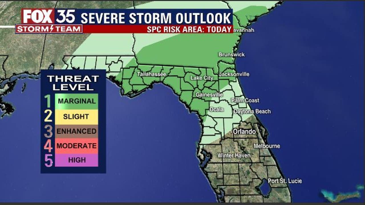 The Storm Prediction Center has outlined that area with a MARGINAL RISK of severe storms during this time. A MARGINAL RISK means that storms could get strong producing isolated damaging wind gusts and potentially a tornado a little closer to the Florida-Georgia border, tornado risk looks quite low.