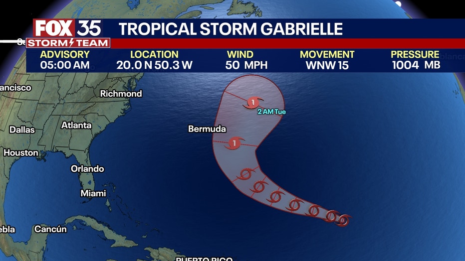 Gabrielle is expected to stay east of Florida and the eastern United States. However, Bermuda should monitor the forecast for potential impacts.