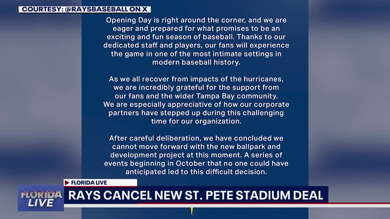 Hunter Tubbs, longtime Rays fan and founder of Rays 24 7 joined FOX 35's Garrett Wymer LIVE to break down his reaction to the Tampa Bay Rays backing out of their new stadium deal in St. Petersburg and walking away from $600 million in public money.