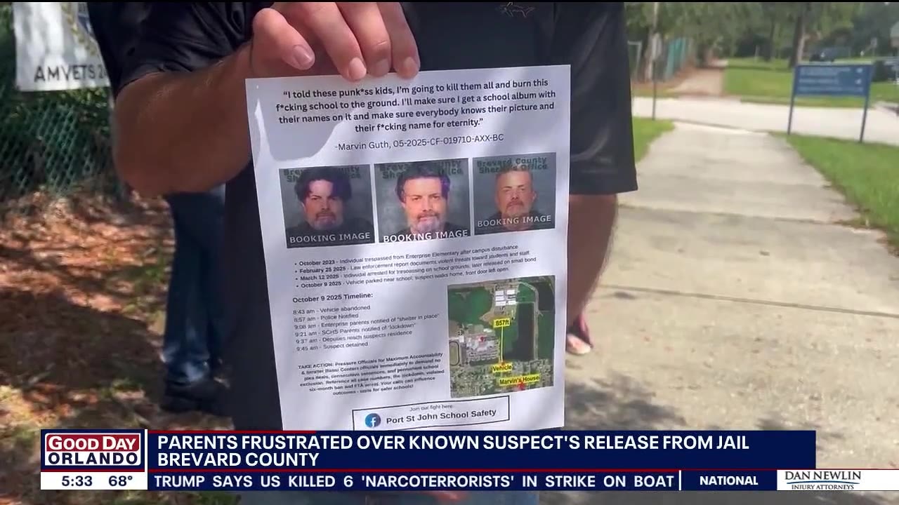 Parents are outraged that a man arrested for trespassing outside a school had made prior threats against students.