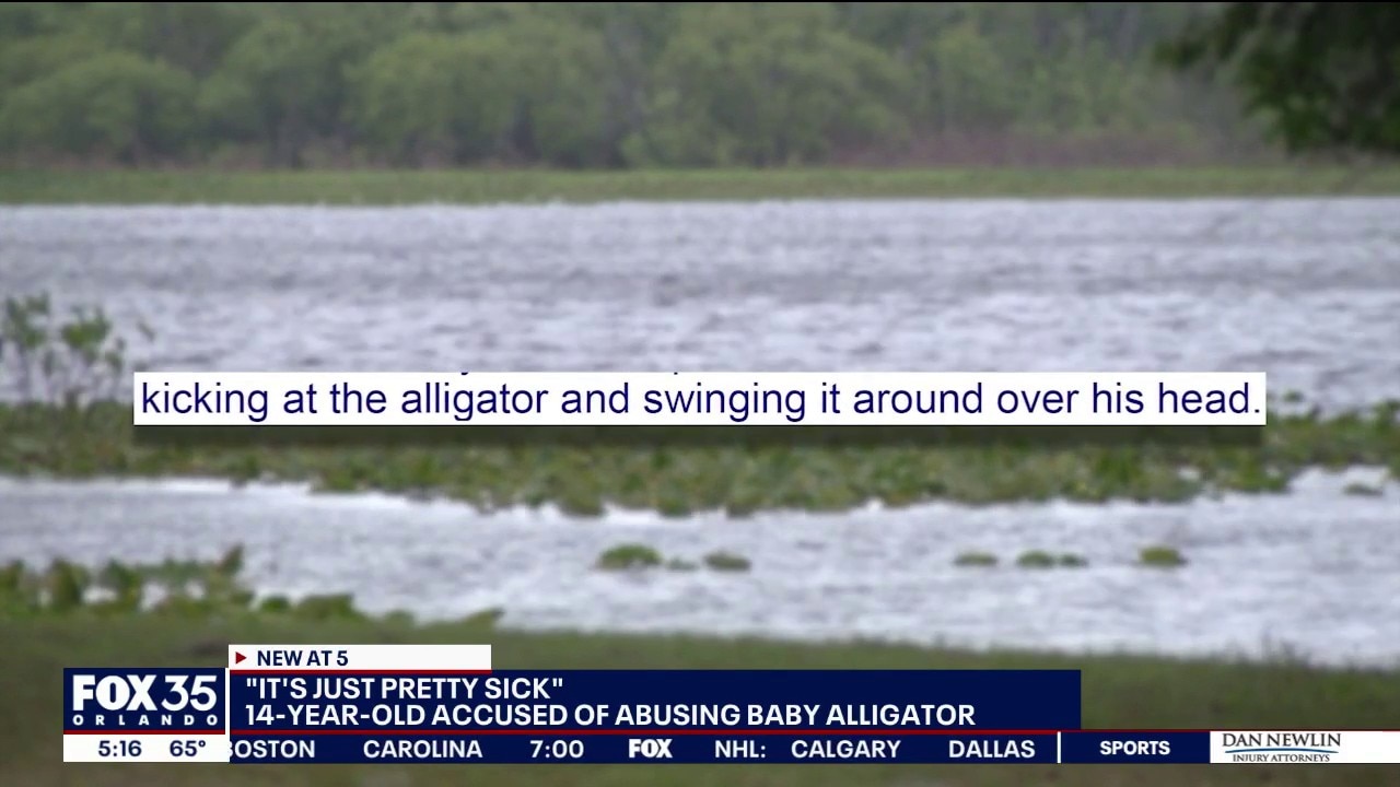 A Florida 14-year-old is potentially facing charges after surveillance video showed him picking up a baby alligator by its tail and swinging it around his head, and kicking dirt onto it, according to the Volusia County Sheriff's Office. The teenager was arrested and booked into the juvenile detention center for possessing or harming an alligator without approval from the Florida Fish & Wildlife Conservation Commission, a level 4 felony, according to the arrest affidavit.