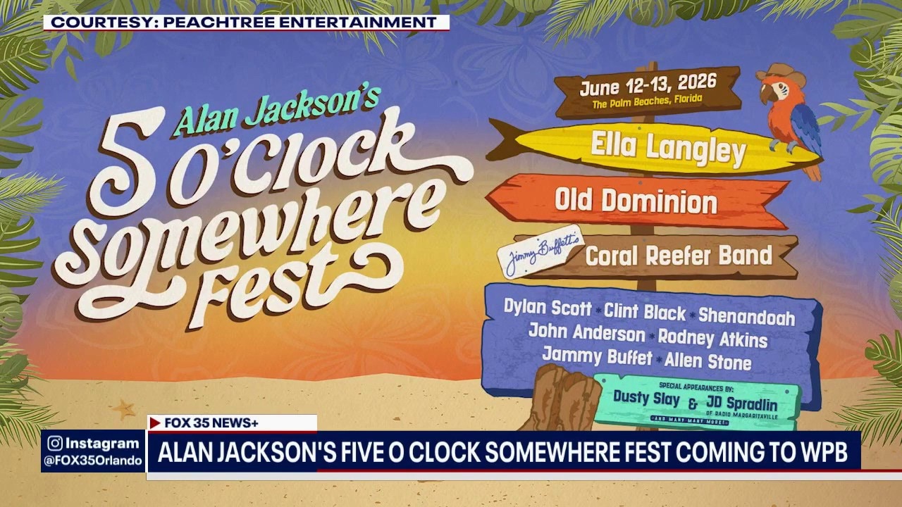 Country music stars Alan Jackson, Ella Langley and Old Dominion are headlining the 5 O' Clock Somewhere Fest coming to West Palm Beach on June 12 and 13. Nathan Baugh, the CEO of PeachTree Entertainment and Alan Jackson's tour manager joined FOX 35's Johnny Jackson via Zoom for a look at the new music festival they're hoping to make an annual event, and look at what makes it different from other music festivals.