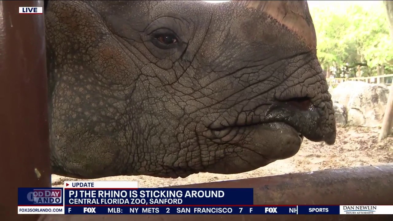 PJ, a greater one-horned rhino, is a long-time resident of the Central Florida Zoo. He was scheduled to relocate to the Buffalo Zoo, but PJ is staying in Florida.