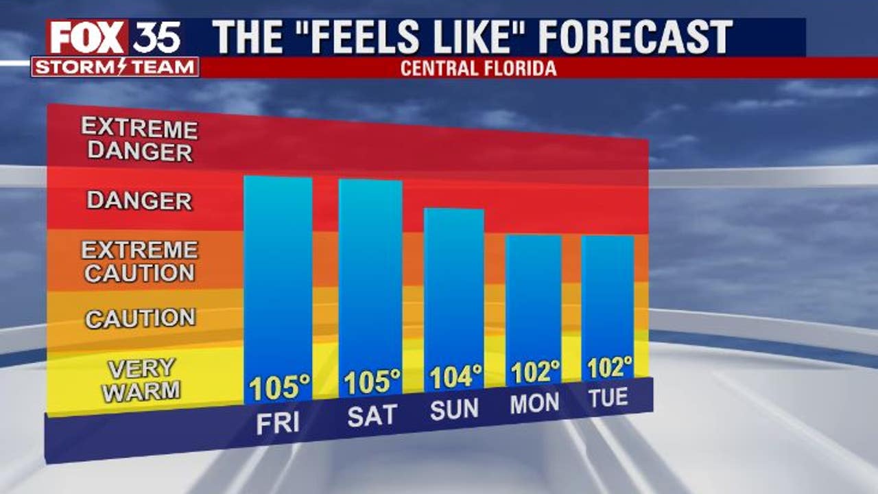 High levels of seasonal humidity will push the heat index or "feels like" temps into the 100°+ mark and this will be the case through the weekend.