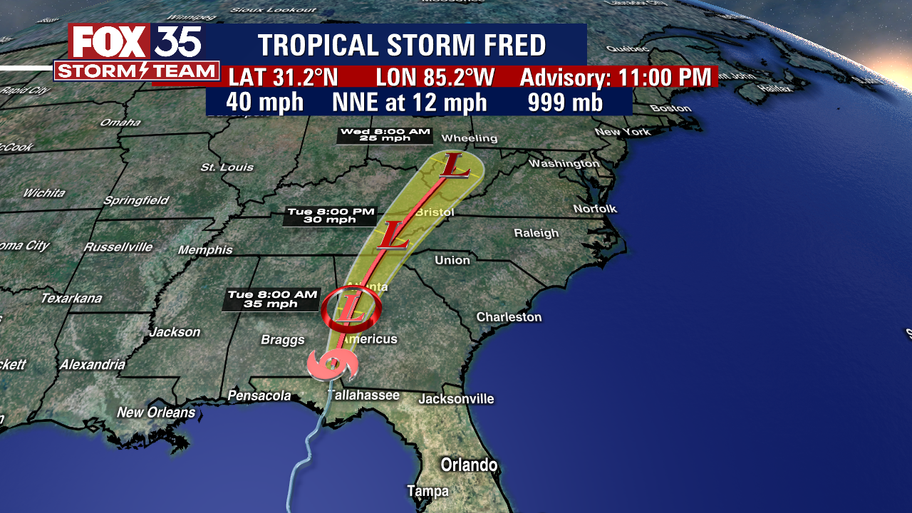 On the forecast track, the center of Fred will move across western and northern Georgia on Tuesday, across the southern Appalachian Mountains on Tuesday night, and into the central Appalachians by early Wednesday.
